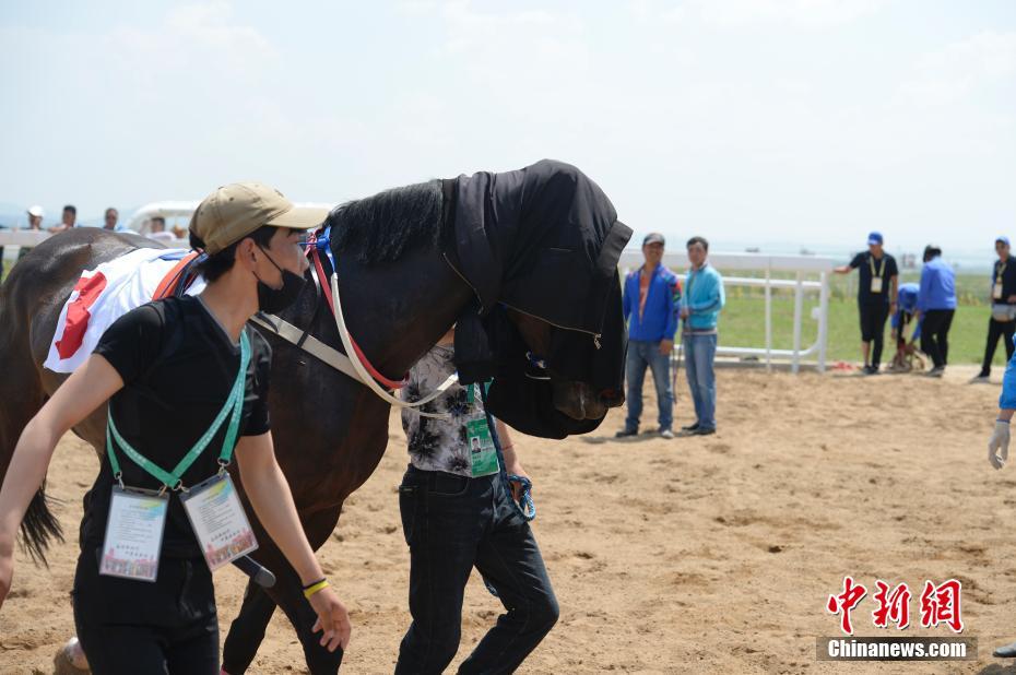 7月12日,速度赛马1000米的比赛中,骑手将马匹眼睛蒙住,准备进起点闸。当日,第十一届全国少数民族传统体育运动会马上项目在呼和浩特市开赛。中新社记者 刘文华 摄