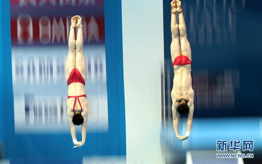 7月13日,练俊杰(右)/司雅杰在比赛中。 当日,在韩国光州举行的世界游泳锦标赛跳水混合双人10米跳台决赛中,中国选手练俊杰/司雅杰以346.14分的成绩获得冠军。 新华社记者李钢摄