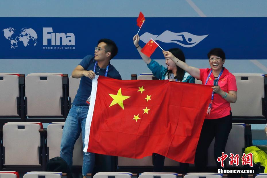 7月13日,观众为中国队加油。当日,在韩国光州举行的2019世界游泳锦标赛跳水女子一米板决赛中,中国选手陈艺文以285.45分的总成绩夺冠。中新社记者 韩海丹 摄