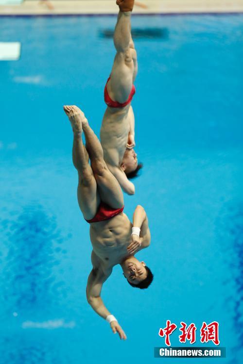 7月13日,在韩国光州举行的2019游泳世锦赛男子三米板决赛中,中国选手曹缘(下)/谢思埸以439.74分夺得冠军。中新社记者 韩海丹 摄