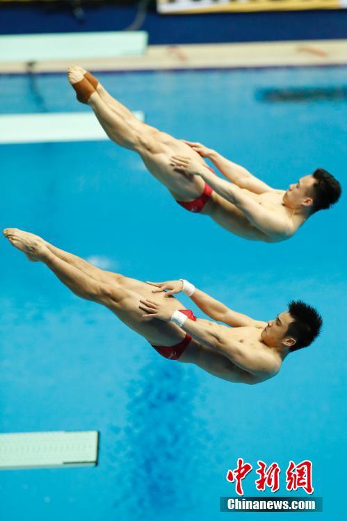 7月13日,在韩国光州举行的2019游泳世锦赛男子三米板决赛中,中国选手曹缘(下)/谢思埸以439.74分夺得冠军。中新社记者 韩海丹 摄