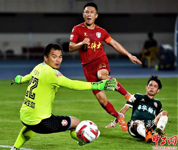2019年7月14日晚,中甲联赛第17轮比赛,北京北体大队5比0战胜梅县铁汉队。比赛上半场北体大队4比0领先对手,北体大队戈武梅开二度,闫相闯和温智豪各入一球。下半场比赛戈武再入一球上演帽子戏法。目前北京北体大队积26分排名第5位,梅县队积23分排名第11位。图为双方的比赛瞬间。工人日报-中工网许之丰摄影报道