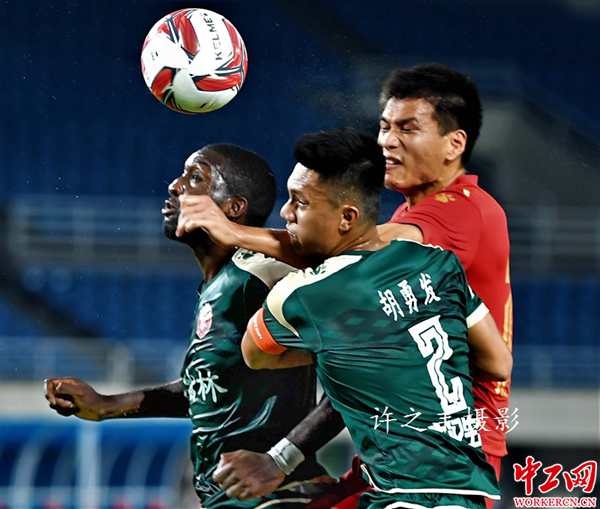 2019年7月14日晚,中甲联赛第17轮比赛,北京北体大队5比0战胜梅县铁汉队。比赛上半场北体大队4比0领先对手,北体大队戈武梅开二度,闫相闯和温智豪各入一球。下半场比赛戈武再入一球上演帽子戏法。目前北京北体大队积26分排名第5位,梅县队积23分排名第11位。图为双方的比赛瞬间。工人日报-中工网许之丰摄影报道