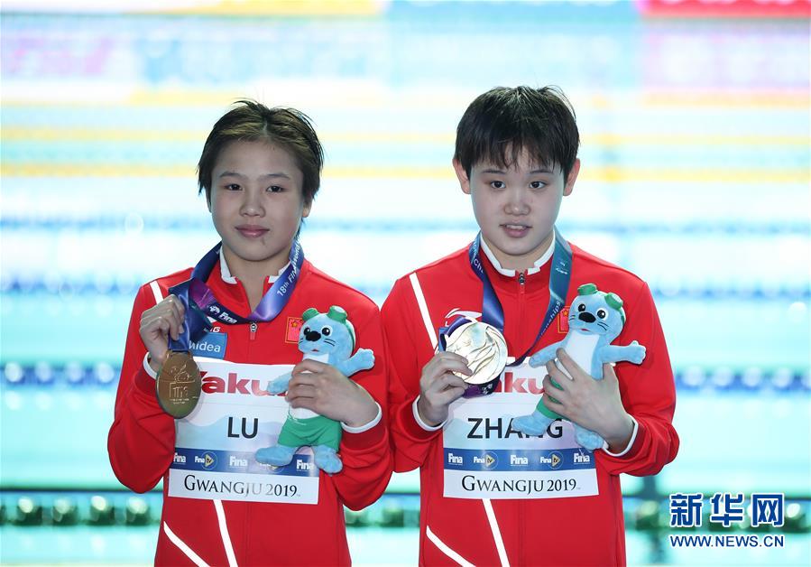 7月14日,中国选手卢为(左)/张家齐展示金牌。 当日,在韩国光州举行的2019游泳世锦赛跳水项目女子双人十米台决赛中,中国选手卢为/张家齐以345.24分的成绩夺得冠军。 新华社记者白雪飞摄