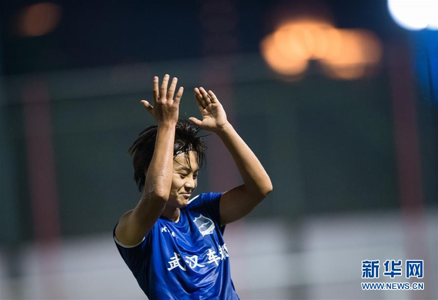 7月14日,王霜在进球后庆祝。 当日,在2019赛季中国足协女子足球超级联赛首轮比赛中,武汉车都江大队主场以2比1战胜战广东辉骏队。 新华社记者肖艺九摄