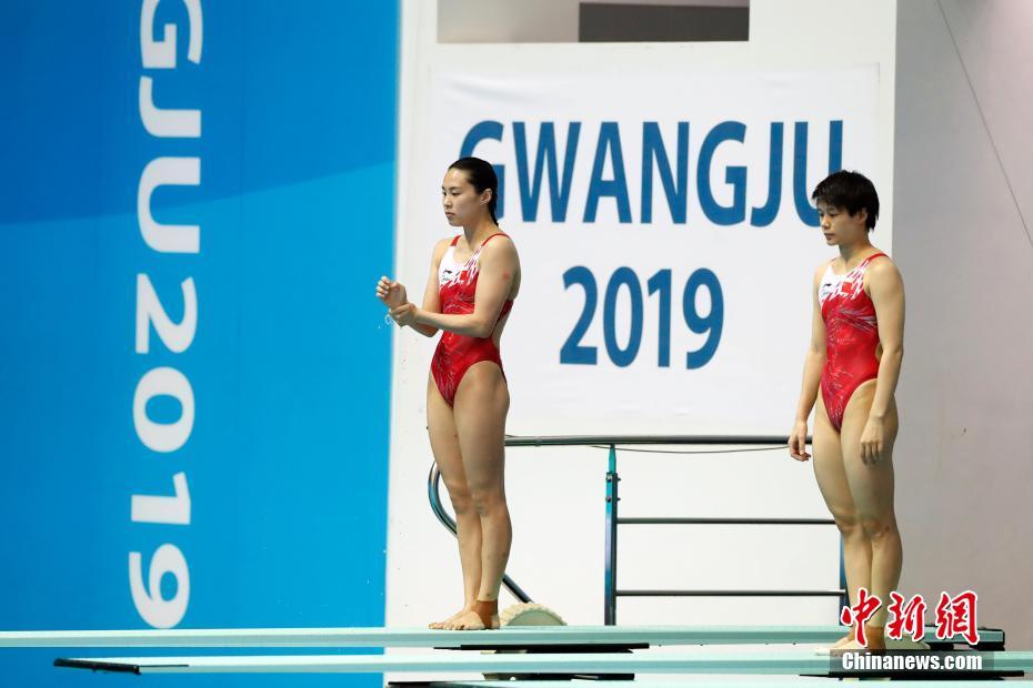 7月15日,在韩国光州举行的2019光州游泳世锦赛女子双人3米跳板决赛中,中国组合施廷懋/王涵以342.00分的成绩获得冠军。图为中国选手施廷懋(右)/王涵在比赛中。中新社记者 韩海丹 摄