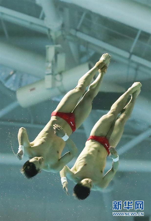 7月15日,中国组合曹缘(右)/陈艾森在比赛中。 当日,在韩国光州举行的2019光州游泳世锦赛男子双人10米跳台决赛中,中国组合曹缘/陈艾森以486.93分的成绩获得冠军。 新华社记者王婧嫱摄