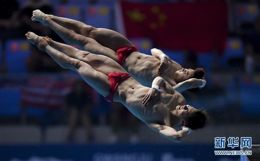 7月15日,中国组合曹缘/陈艾森(前)在比赛中。 当日,在韩国光州举行的2019光州游泳世锦赛男子双人10米跳台决赛中,中国组合曹缘/陈艾森以486.93分的成绩获得冠军。 新华社记者夏一方摄