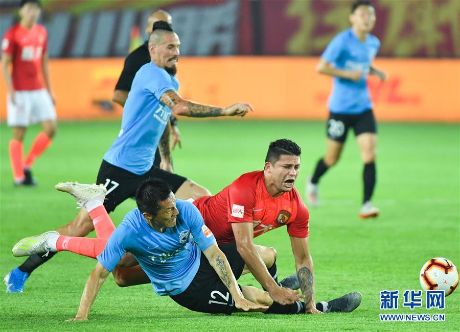 7月16日,广州恒大淘宝队球员埃尔克森(前右)在比赛中被大连一方队球员周挺(前左)铲倒。 当日,在2019赛季中超联赛第18轮比赛中,广州恒大淘宝队主场以4比1战胜大连一方队。 新华社记者刘大伟摄