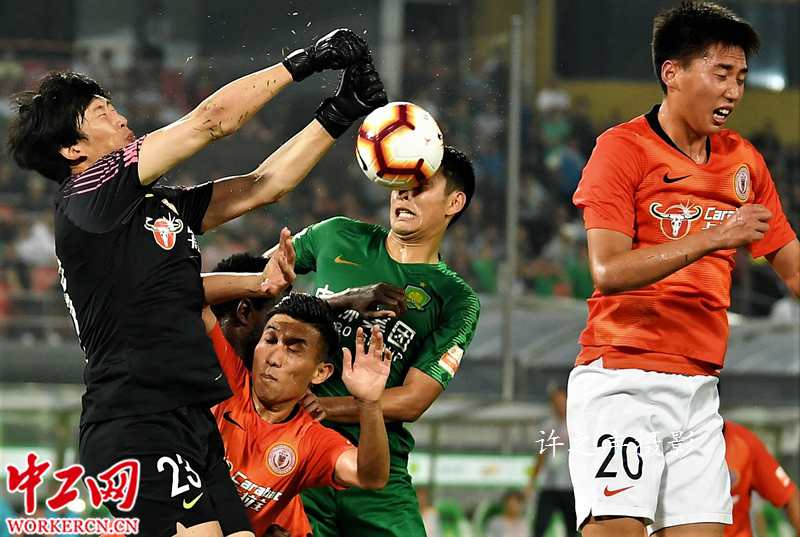 2019年7月17日晚,中超联赛第18轮比赛,北京中赫国安主场2比1战胜北京人和,国安继续以2分优势领跑积分榜。比赛第6分钟,国安队王子铭接金泰延传球头球破门;第60分钟,迪奥普利用任意球机会为人和扳平比分;第80分钟,奥古斯托赢得点球,为国安打入决胜球。图为双方的比赛瞬间。工人日报-中工网许之丰摄影报道