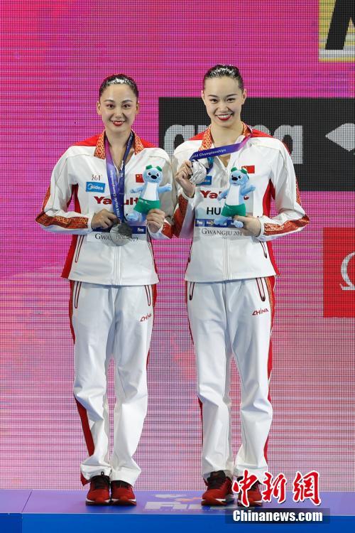 7月18日,中国组合黄雪辰(右)/孙文雁在颁奖仪式上。当日,在韩国光州举行的2019游泳世锦赛花样游泳双人自由自选决赛中,中国组合黄雪辰/孙文雁以95.7667分摘得银牌。中新社记者 韩海丹 摄