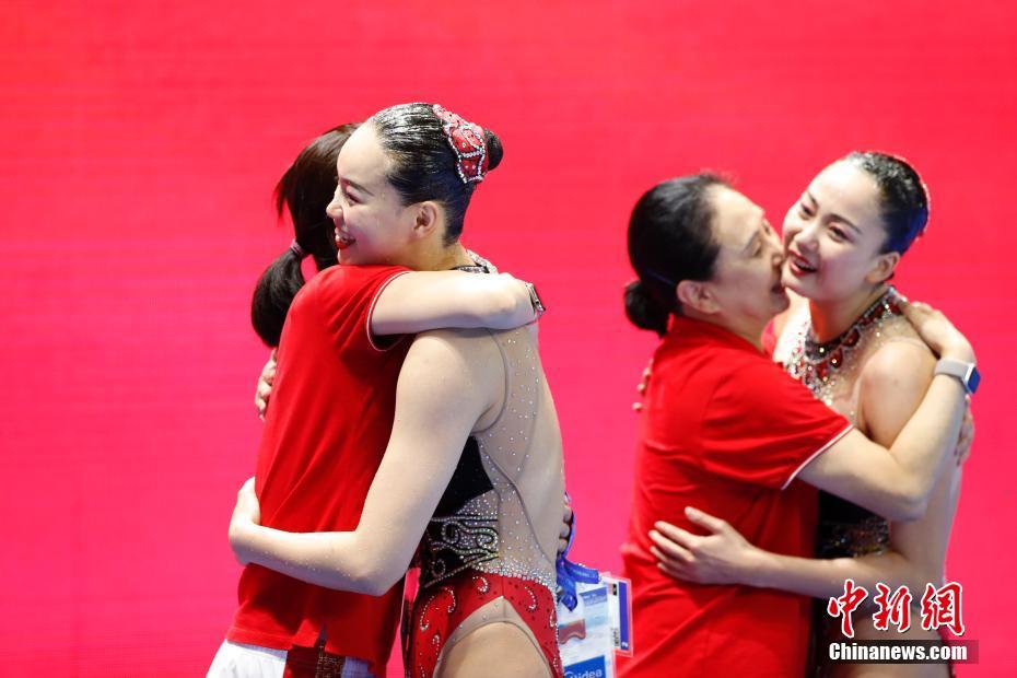 7月18日,中国组合黄雪辰(左二)/孙文雁赛后与教练拥抱庆祝。当日,在韩国光州举行的2019游泳世锦赛花样游泳双人自由自选决赛中,中国组合黄雪辰/孙文雁以95.7667分摘得银牌。中新社记者 韩海丹 摄