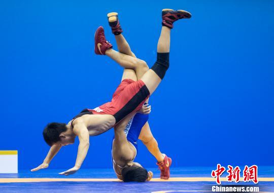 青年运动员擂台上演精彩摔跤对决。 武俊杰 摄