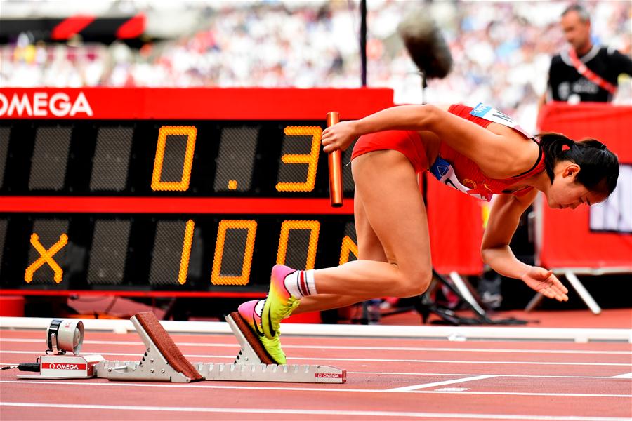 7月20日,中国队选手梁小静在比赛中。 当日,在英国伦敦举行的2019年国际田联钻石联赛伦敦站女子4X100米接力比赛中,由葛曼棋、孔令微、梁小静、韦永丽组成的中国队以42秒71的成绩夺得季军。 新华社发(阿尔贝托·佩扎利摄)