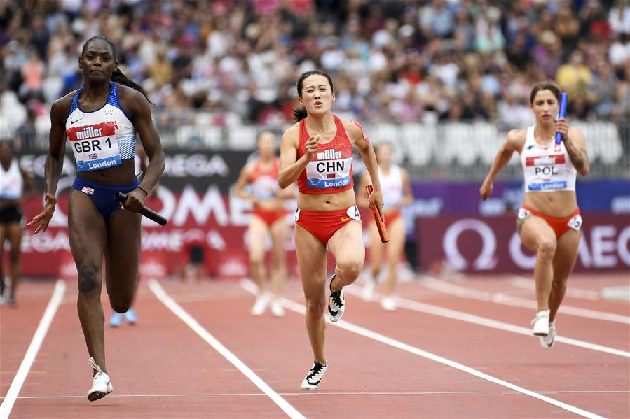 7月20日,中国队选手孔令微(中)在比赛中。 当日,在英国伦敦举行的2019年国际田联钻石联赛伦敦站女子4X100米接力比赛中,由葛曼棋、孔令微、梁小静、韦永丽组成的中国队以42秒71的成绩夺得季军。 新华社发(阿尔贝托·佩扎利摄)
