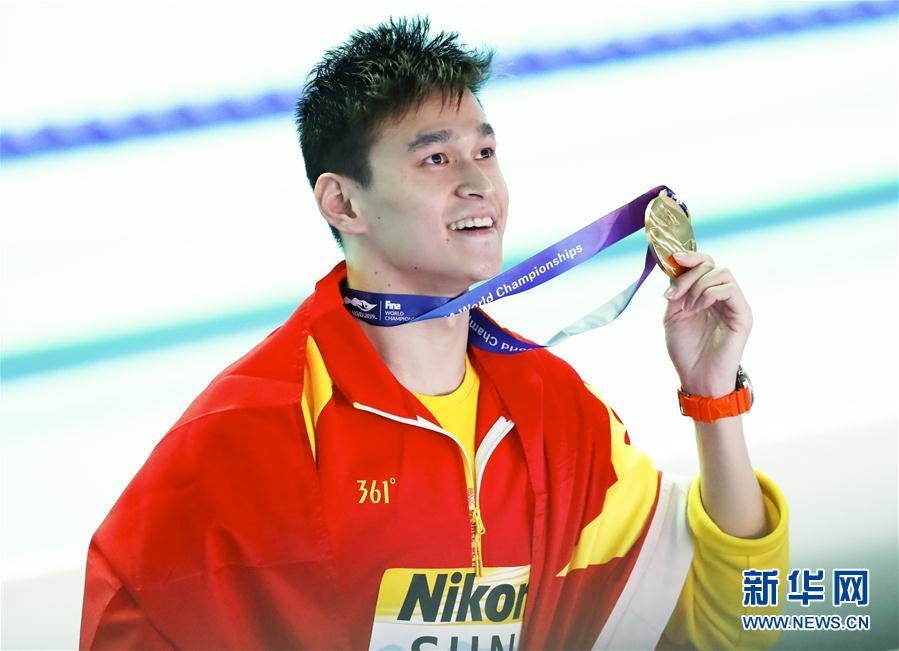 7月21日,孙杨展示奖牌。 当日,在韩国光州举行的2019游泳世锦赛男子400米自由泳决赛中,中国选手孙杨夺得冠军。 新华社记者王婧嫱摄