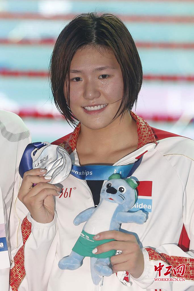 7月22日,叶诗文展示奖牌。当日,在韩国光州举行的2019国际泳联世界游泳锦标赛女子200米个人混合泳决赛中,中国选手叶诗文以2分08秒60的成绩获得亚军。 韩海丹(摄影部)/中新社/视觉中国 图片来源:视觉中国