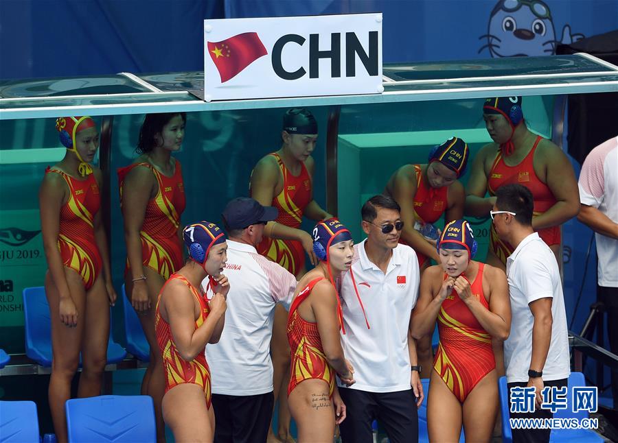 7月22日,中国女子水球队主教练龚大立(前右三)在比赛结束后与队员握手致意。 当日,在韩国光州举行的世界游泳锦标赛女子水球第9-12名比赛中,中国队与加拿大队战成10比10平。在点球大战中,中国队以6比7告负。 新华社记者陶希夷摄