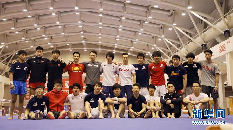 2019年1月30日,中日体操男队队员在国家体育总局训练局体操馆共同训练结束后合影。新华社发(雒圆摄)