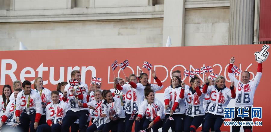 2016年10月18日,在里约奥运会和残奥会上赢得奖牌的英国运动员在伦敦市中心特拉法加广场举行庆祝仪式,庆祝英国代表团在里约的成功。英国代表团在里约奥运会上赢得67块奖牌,是1908年伦敦奥运会之后赢得奖牌最多的一届奥运会。新华社记者韩岩摄