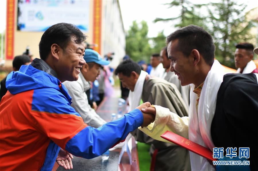 图为西藏拉萨喜马拉雅登山向导学校校长次仁桑珠(左)表彰10名优秀向导(2019年7月12日摄)。 新华社记者普布扎西摄