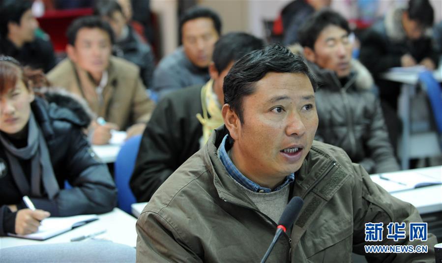 图为时任西藏登山队队长、西藏登山学校校长尼玛次仁(前)为参加高山探险专业知识培训的学员讲解西藏登山历史(2008年11月25日摄)。 新华社记者格桑达瓦摄