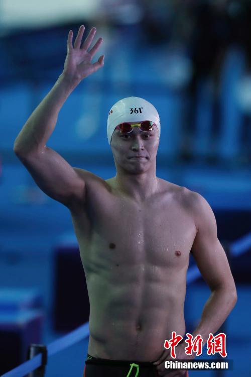 7月24日,孙杨比赛后挥手致意。当日,在韩国光州举行的2019国际泳联世界游泳锦标赛男子800米自由泳决赛中,中国选手孙杨以7分45秒01的成绩获得第六名。中新社记者 韩海丹 摄