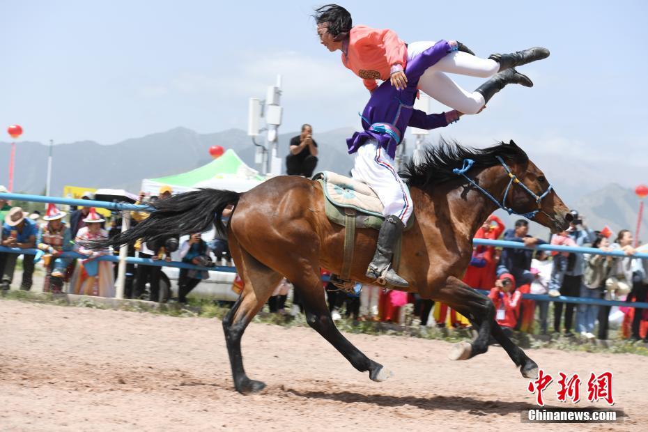 7月27日,甘肃张掖市肃南裕固族自治县丝路赛马会上演的少数民族“马上芭蕾”,精彩纷呈。当日,2019中国丝路大赛马——肃南裕固族自治县第二季赛马大会举行。据悉,此次赛马会有来自青海、内蒙等地和本县的16支代表团共200余匹马参加速度马、走马比赛,同时在开幕式现场还进行了精彩的马术表演。中新社记者 杨艳敏 摄
