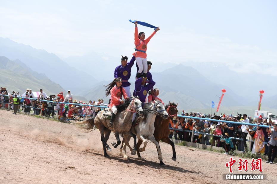 7月27日,甘肃张掖市肃南裕固族自治县丝路赛马会上演的少数民族“马上芭蕾”,精彩纷呈。当日,2019中国丝路大赛马——肃南裕固族自治县第二季赛马大会举行。据悉,此次赛马会有来自青海、内蒙等地和本县的16支代表团共200余匹马参加速度马、走马比赛,同时在开幕式现场还进行了精彩的马术表演。中新社记者 杨艳敏 摄