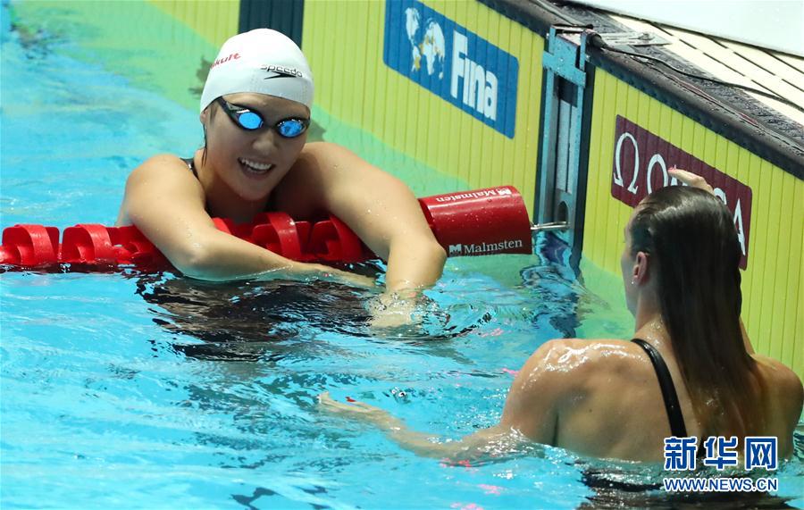 7月28日,亚军中国选手叶诗文(左)与冠军匈牙利选手霍苏在赛后交流。 当日,在韩国光州举行的2019国际泳联世界游泳锦标赛女子400米个人混合泳决赛中,中国选手叶诗文以4分32秒07的成绩获得银牌。 新华社记者李钢摄