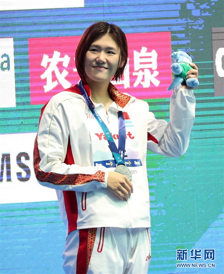 7月28日,叶诗文在颁奖仪式上。 当日,在韩国光州举行的2019国际泳联世界游泳锦标赛女子400米个人混合泳决赛中,中国选手叶诗文以4分32秒07的成绩获得银牌。 新华社记者李钢摄