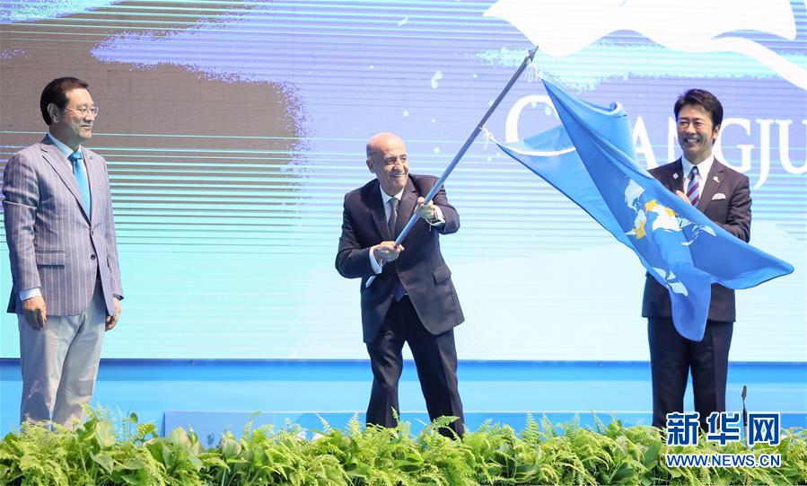 7月28日,国际泳联主席胡里奥·马格里奥尼(中)挥动国际泳联会旗。 当日,2019国际泳联世界游泳锦标赛在韩国光州举行闭幕式。 新华社记者白雪飞摄