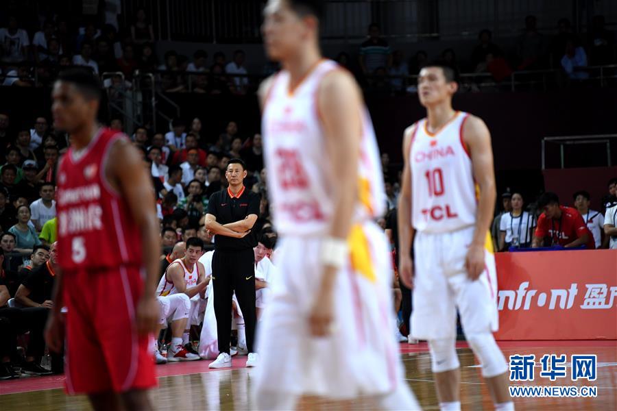 7月28日,中国队主教练李楠(左二)在场边观战。 当日,在西安举行的2019年中喀国际男篮对抗赛中,中国队以85比63战胜喀麦隆队。 新华社记者李一博摄