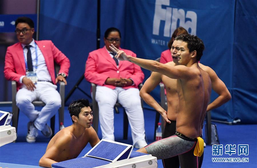 7月28日,闫子贝(前左)、李朱濠(前中)和徐嘉余(前右)在比赛后庆祝。 当日,在韩国光州举行的2019国际泳联游泳世锦赛男子4x100米混合泳接力决赛中,中国队以3分31秒61的成绩获得第七名。 新华社记者白雪飞摄