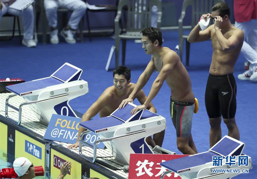 7月28日,中国队选手闫子贝(左)、李朱濠(右)和徐嘉余在比赛后。 当日,在韩国光州举行的2019国际泳联游泳世锦赛男子4x100米混合泳接力决赛中,中国队以3分31秒61的成绩获得第七名。 新华社记者李钢摄