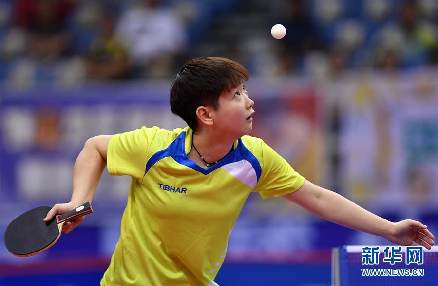 7月29日,孙颖莎在比赛中发球。 当日,在天津武清举行的2019年全国乒乓球锦标赛女子单打决赛中,河北队选手孙颖莎以4比0战胜八一南昌一队选手朱雨玲,夺得冠军。 新华社记者李然摄
