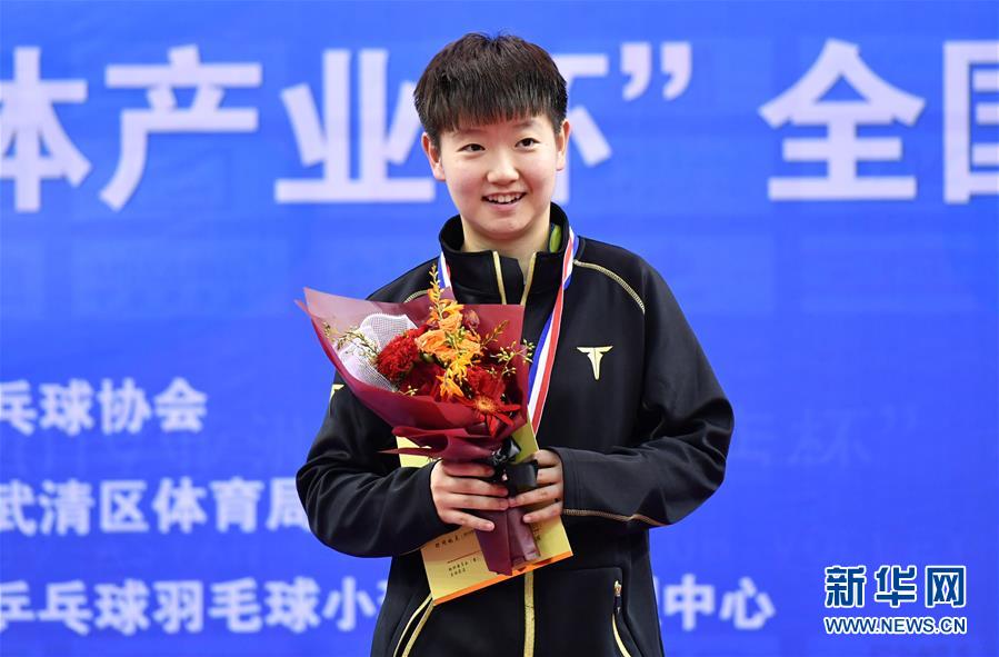 7月29日,孙颖莎在颁奖仪式上。 当日,在天津武清举行的2019年全国乒乓球锦标赛女子单打决赛中,河北队选手孙颖莎以4比0战胜八一南昌一队选手朱雨玲,夺得冠军。 新华社记者李然摄