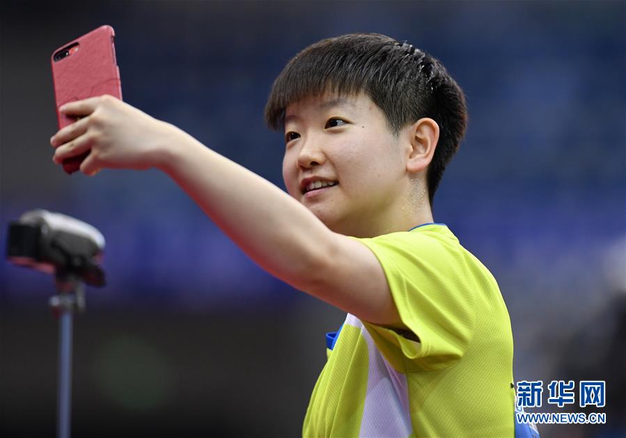 7月29日,孙颖莎在比赛后自拍庆祝。 当日,在天津武清举行的2019年全国乒乓球锦标赛女子单打决赛中,河北队选手孙颖莎以4比0战胜八一南昌一队选手朱雨玲,夺得冠军。 新华社记者李然摄