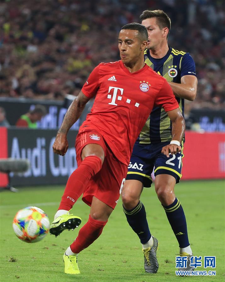 7月30日,拜仁慕尼黑队球员蒂亚戈(左)在费内巴切队球员扎伊茨的防守下控球。 当日,在德国慕尼黑举行的奥迪杯足球赛半决赛中,德甲拜仁慕尼黑队以6比1战胜土超费内巴切队,晋级决赛。 新华社发(菲利普·鲁伊兹摄)