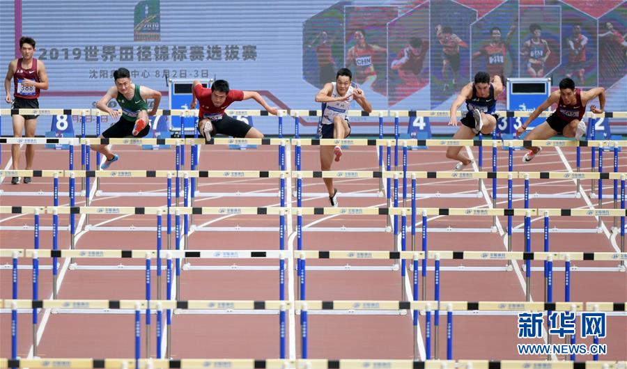 8月2日,上海选手谢文骏(左三)在比赛中。 当日,在沈阳举行的2019世界田径锦标赛选拔赛男子110米栏预赛中,上海选手谢文骏以13秒94的成绩位列第一,晋级决赛。 新华社记者杨青摄