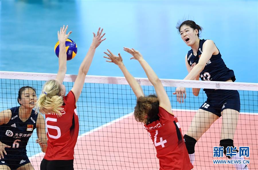 8月3日,中国队球员李盈莹(右)在比赛中进攻。 当日,在浙江宁波市北仑区举行的2019国际排联东京奥运会女排资格赛B组比赛中,中国队以3比1战胜德国队。 新华社记者李俊东摄