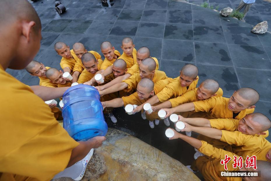8月4日,正处三伏天气,少林寺的所在地河南登封,少林小子们在禅宗少林音乐大典冒着酷暑坚持练功。少林罗汉阵、铁布衫·三枪刺身、少林棍、少林石锁功、铁掌劈砖、击水练功、拳脚对打等,在夏日的高温中追寻少林绝学。在训练中,少林小子们辗转腾挪,石锁棍枪,各种招式轮番上阵,即使大汗淋漓,练功服湿透,也没有丝毫退怯!渴了累了,抱起水桶來番畅饮,对他们来说,“夏练三伏”不仅提高了自身的耐热能力和身体素质,更重要的是锻炼了坚韧不拔的精神意志力。图为依次等候喝水。 中新社记者 王中举 摄