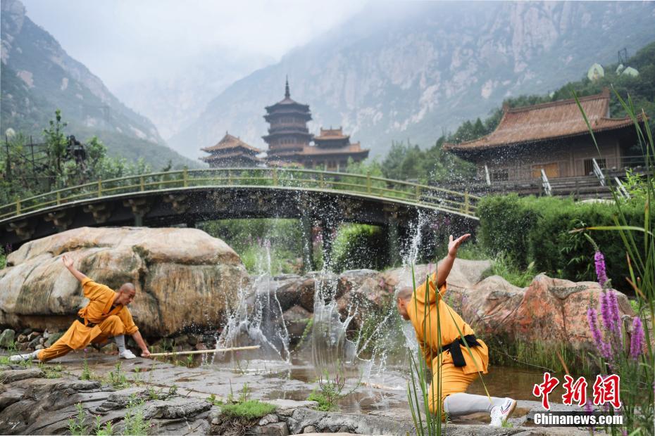 8月4日,正处三伏天气,少林寺的所在地河南登封,少林小子们在禅宗少林音乐大典冒着酷暑坚持练功。少林罗汉阵、铁布衫·三枪刺身、少林棍、少林石锁功、铁掌劈砖、击水练功、拳脚对打等,在夏日的高温中追寻少林绝学。在训练中,少林小子们辗转腾挪,石锁棍枪,各种招式轮番上阵,即使大汗淋漓,练功服湿透,也没有丝毫退怯!渴了累了,抱起水桶來番畅饮,对他们来说,“夏练三伏”不仅提高了自身的耐热能力和身体素质,更重要的是锻炼了坚韧不拔的精神意志力。图为少林棍。 中新社记者 王中举 摄
