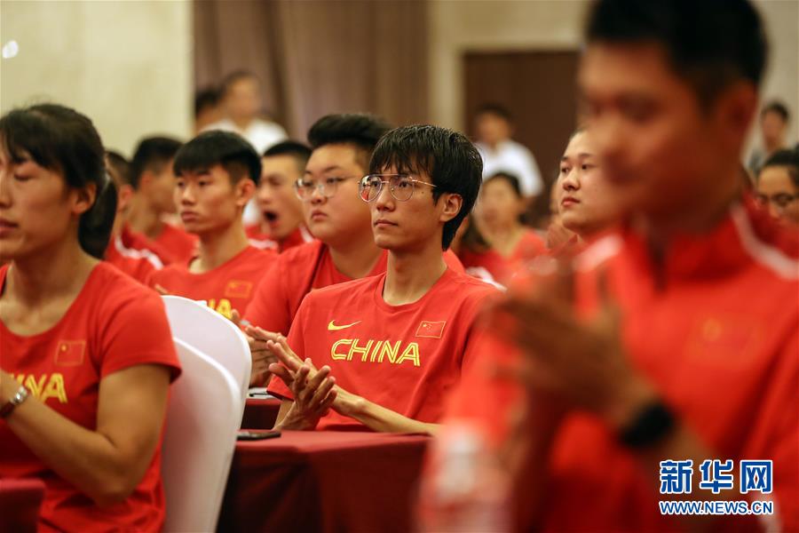 8月4日,跳高运动员王宇(中)在动员会上。 当日,中国田径队备战多哈世锦赛动员会在沈阳举行。2019年世界田径锦标赛将于9月27日在卡塔尔多哈开赛。 新华社记者潘昱龙摄