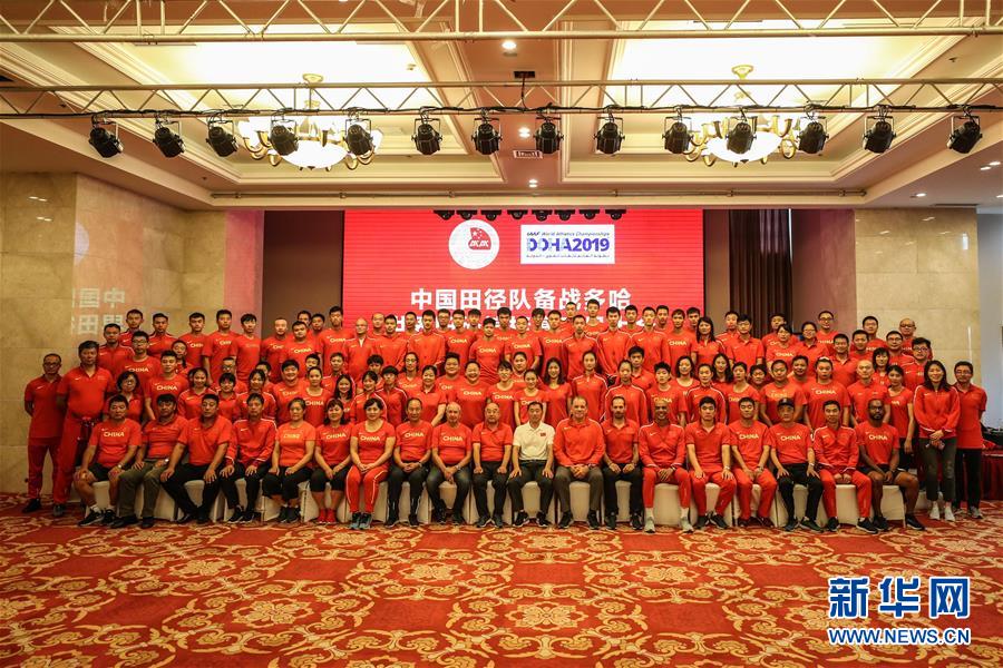 8月4日,参会人员在会后合影。 当日,中国田径队备战多哈世锦赛动员会在沈阳举行。2019年世界田径锦标赛将于9月27日在卡塔尔多哈开赛。 新华社记者潘昱龙摄