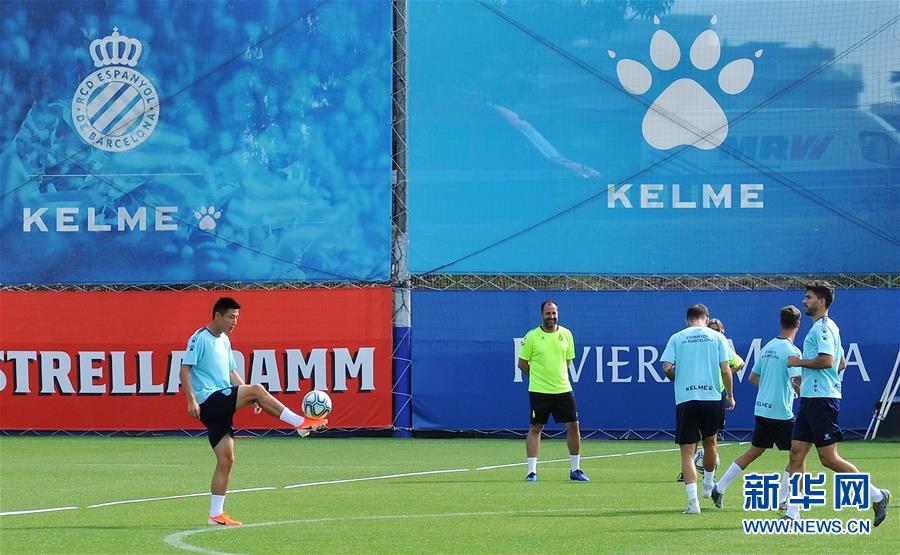 8月6日,武磊(左一)在巴塞罗那参加西班牙人队训练。 当日,西甲球队西班牙人队在巴塞罗那的训练场进行训练。中国球员武磊与队友一起参加。 新华社记者郭求达摄