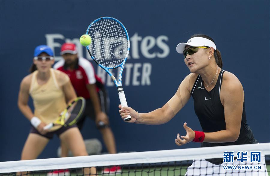 8月6日,段莹莹(右)/郑赛赛在比赛中。 当日,在加拿大多伦多进行的2019年加拿大罗杰斯杯网球赛女双首轮比赛中,中国选手段莹莹/郑赛赛以1比2不敌达丽娅·尤拉克(克罗地亚)/玛丽亚·何塞·马丁内斯(西班牙),无缘第二轮 新华社发(邹峥摄)