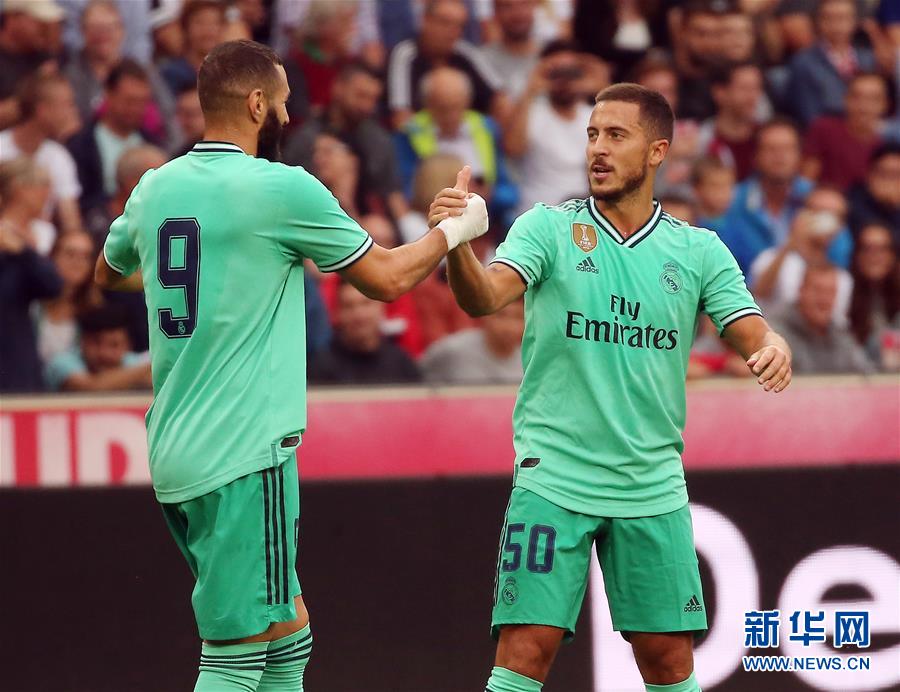 8月7日,皇家马德里队球员阿扎尔(右)与队友本泽马庆祝进球。 当日,在奥地利萨尔茨堡举行的一场足球友谊赛中,西班牙皇家马德里队以1比0战胜奥地利萨尔茨堡红牛队。 新华社/法新