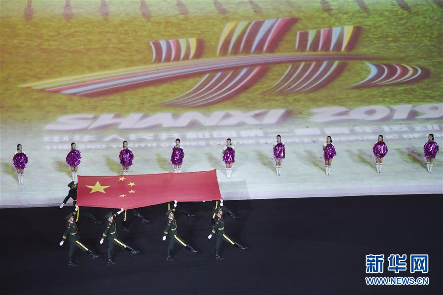 8月8日,旗手护送中华人民共和国国旗入场。 当日,第二届全国青年运动会开幕式在山西省太原市山西体育中心“红灯笼”体育场举行。 新华社记者鞠焕宗摄