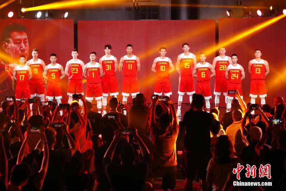 8月8日,中国男篮征战2019年国际篮联篮球世界杯的全新战袍在北京公布,包括易建联、郭艾伦、周琦等在内的13名中国男篮队员身着全新球衣在主教练李楠的带领下亮相球衣发布会。新款球衣以“火箭升空”为灵感,色调以红色为基础色,并加以大面积的白色上领,材料上采用回收聚酯(每件球衣使用约20个回收的塑料瓶)制成。中新社记者 富田 摄